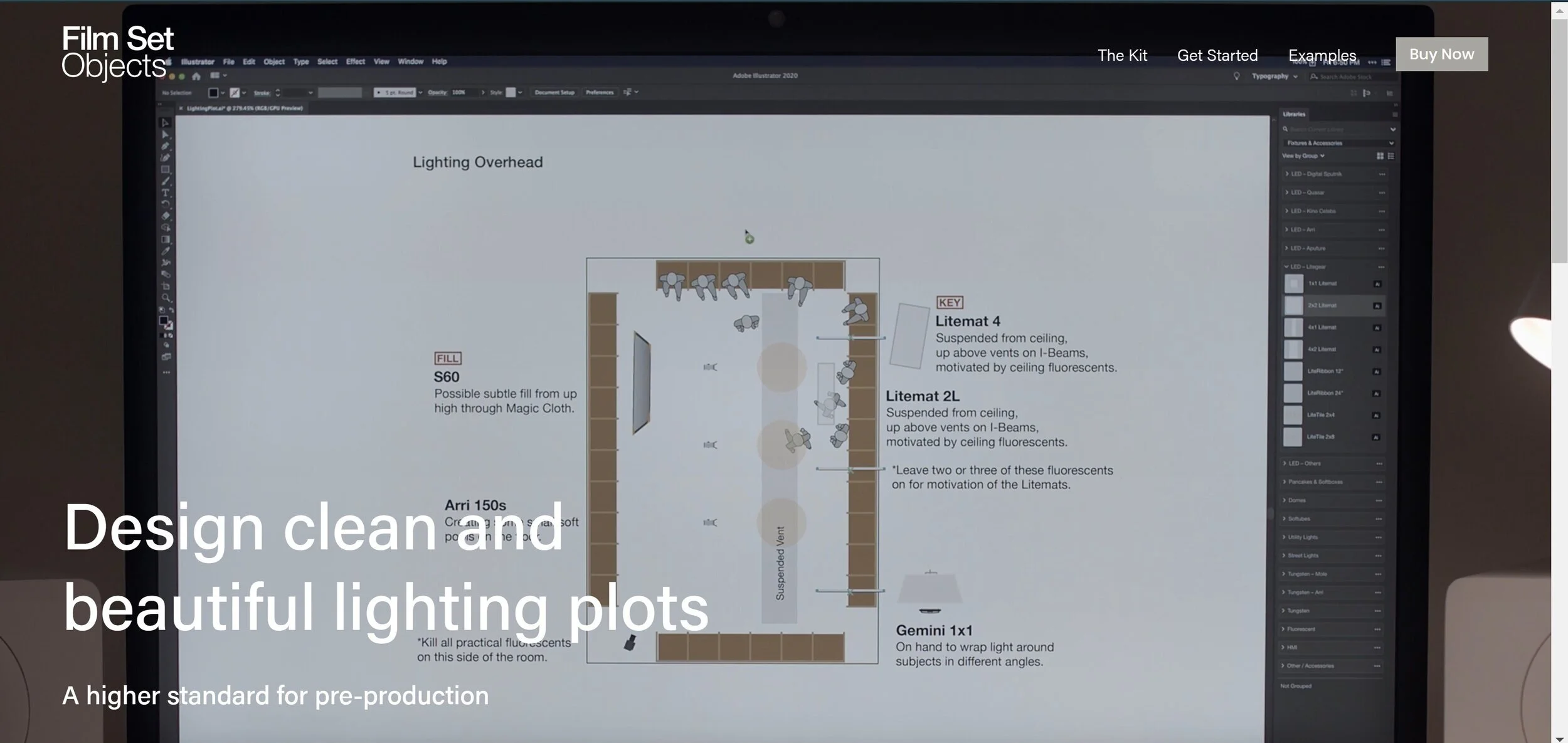 Film Set Objects is a pack of icons that are used for building out lighting diagrams. With your download you get a set of 350 icons which are organized into folders off all of your most used lights on set. You can choose your camera, fluorescent fixtures, LEDs, HMIs, tungsten, rags, rigging and more. The pack is very easy to use and I was drawing out lighting plots within a few minutes of downloading. The results are very quick diagrams that look and feel very professional. I would be confident to share a finished plot with any of my clients. I cannot say enough good things about Film Set Objects. Plus, this is a product made by a DP in Portland, OR named Evan Oliver.